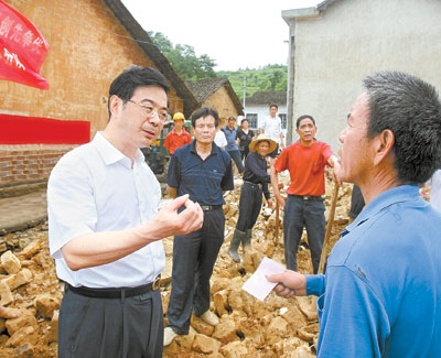 在一處廢墟上,村里的黨員干部正帶領(lǐng)村民們幫助倒房戶清理倒塌的房屋。周強(qiáng)走到大伙中間,同大家詳細(xì)交談,充分肯定農(nóng)村基層黨支部和廣大黨員在抗洪搶險(xiǎn)和災(zāi)后重建中發(fā)揮的突出作用,同大家一道商量如何帶領(lǐng)受災(zāi)群眾,盡快開展災(zāi)后重建、救災(zāi)補(bǔ)損。一位老支書說,村里水利基礎(chǔ)設(shè)施在洪水中損毀嚴(yán)重,這一塊應(yīng)該是災(zāi)后重建的重點(diǎn)。周強(qiáng)立刻接過話頭說,我們想到一塊了。