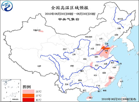 中央氣象臺6月30日06時繼續(xù)發(fā)布高溫藍色預警:預計,今天白天,河北南部、河南東部和北部、山東大部、安徽北部、江蘇西北部、湖北西部、福建中南部的部分地區(qū)、廣東東部、海南北部等地有35~37℃的高溫。