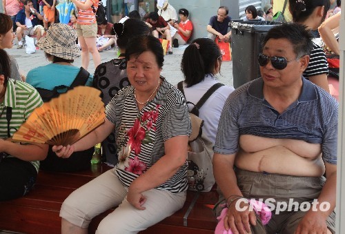 7月1日,上海世博園區(qū)氣溫突破攝氏37度,一些游客袒胸露肚、搖扇納涼應(yīng)對高溫。 中新社發(fā) 潘索菲 攝