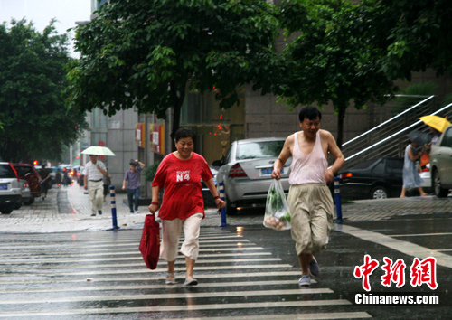 沒(méi)有攜帶雨具的行人奔跑尋找躲雨處。 孟幻 攝