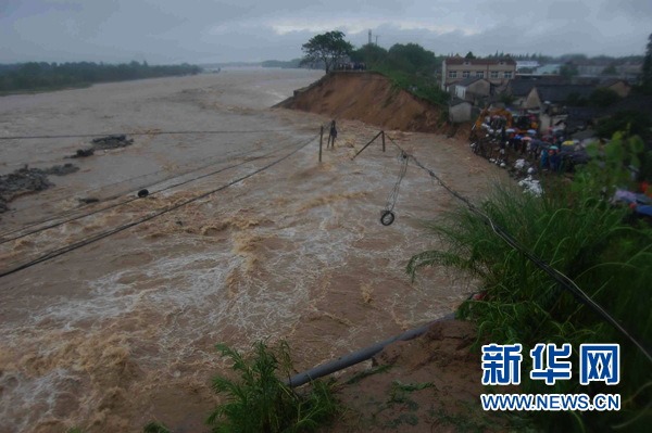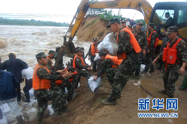安徽省桐城市大沙河青草段發(fā)生崩岸的現(xiàn)場(2010年7月11日攝)。連日來,安徽桐城市遭受歷史罕見的特大暴雨襲擊。11日上午10時,桐城市大沙河青草段發(fā)生決堤,武警安慶市支隊110名官兵火速趕赴現(xiàn)場,努力填堵缺口。新華社發(fā)(廖福安 攝)