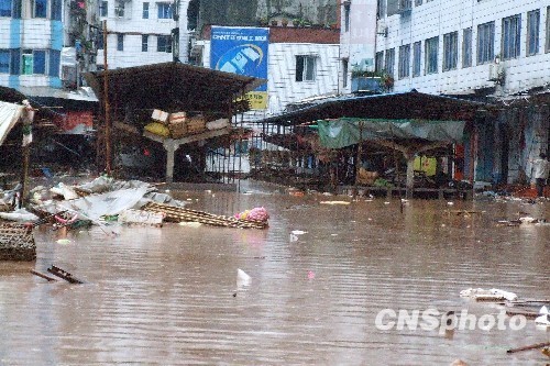 2010年7月10日11時(shí)左右暴雨再次襲擊重慶市萬州區(qū)分水鎮(zhèn),場(chǎng)鎮(zhèn)農(nóng)貿(mào)市場(chǎng)、小學(xué)、老林口農(nóng)貿(mào)市場(chǎng)等局部地區(qū)洪水高峰時(shí)期深達(dá)1.5米左右。中新社發(fā) 趙俊超 攝