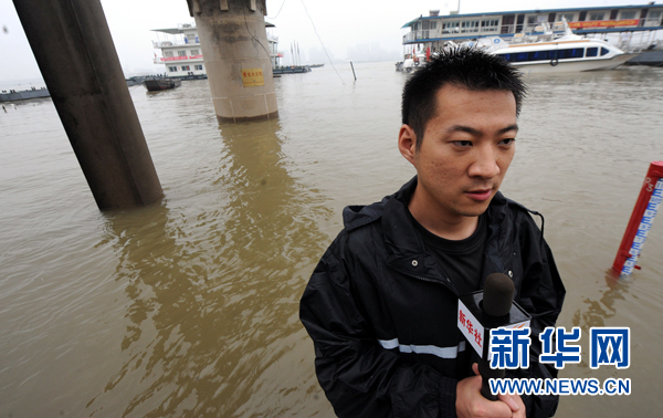 7月13日,一名記者在武漢關(guān)水文站前作現(xiàn)場報道。當日,長江武漢關(guān)水位上漲26.15米,超設防1.15米。受持續(xù)強降雨影響,長江流域多處發(fā)生超警戒洪水,中下游干流各站水位繼續(xù)上漲。新華社記者 余國慶 攝