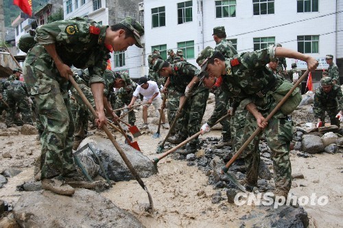 云南省昭通市巧家縣小河鎮(zhèn)鎮(zhèn)政府所在地近日因遭受暴風雨襲擊,引發(fā)特大滑坡泥石流災害。圖為駐地的武警云南總隊昭通支隊150名官兵第一時間趕赴現(xiàn)場參與搶險救災。 中新社發(fā) 謝學浩 攝