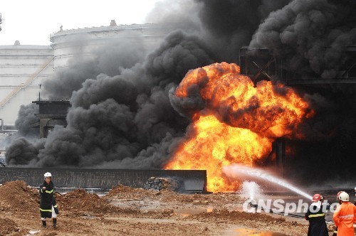 7月17日,消防隊員在火災(zāi)現(xiàn)場撲火。當(dāng)日10時,大連市政府召開新聞發(fā)布會,宣布大連新港輸油管道爆炸現(xiàn)場儲油罐的所有閥門全部關(guān)閉,火勢基本撲滅,事故未造成人員傷亡。16日18時許,大連新港附近中石油的一條輸油管道發(fā)生爆炸起火。起火管道為直徑900毫米的原油儲罐陸地輸油管線,后引起700毫米管線起火,油罐沒有起火。燃燒產(chǎn)生氣體主要為含硫和芳烴類氣體,無劇毒。 中新社發(fā) 劉德斌 攝