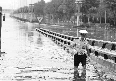 交警涉水疏通交通。本報(bào)記者 陳更生攝