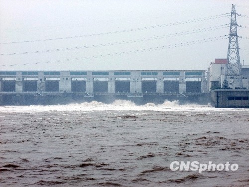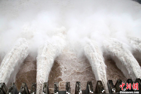 7月20日8時(shí),峰值為7萬(wàn)立方米/秒的洪水抵達(dá)三峽大壩。這是三峽工程建成后的首次大規(guī)模洪峰。大壩共開(kāi)啟9個(gè)泄洪深孔,將洪水下泄流量控制在4萬(wàn)立方米/秒左右,削減了4成多的洪峰下泄流量。中新社發(fā) 劉良偉 攝