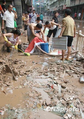 四川省廣安市廣安區(qū)城區(qū)特大洪水慢慢消退。7月21日,當(dāng)?shù)攸h政軍和社會(huì)各界人士采取“水退人進(jìn)”措施分段沖洗街道。 中新社發(fā) 杜修戰(zhàn) 攝