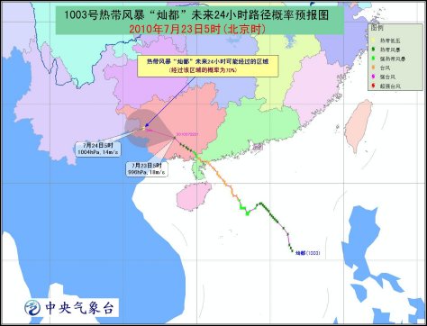中央氣象臺7月23日06時發(fā)布臺風(fēng)藍(lán)色預(yù)警:22日20時,今年第3號臺風(fēng)“燦都”其中心進(jìn)入廣西博白境內(nèi),隨后減弱為熱帶風(fēng)暴。預(yù)計將向西偏北方向移動,強度繼續(xù)減弱。