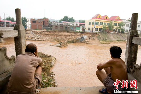 7月25日,河南西峽民眾無(wú)奈地守候在被大水沖壞的大橋旁,當(dāng)日的洪峰將西峽丹水鎮(zhèn)的大橋連根拔起,將橋面和幾十噸重的橋墩沖的無(wú)影無(wú)蹤。中新社發(fā) 王中舉 攝