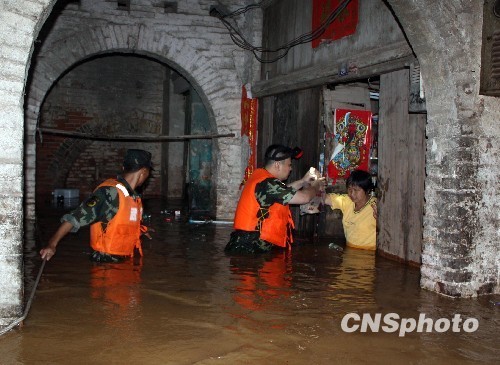 7月24日0點,武警戰(zhàn)士在解救、轉(zhuǎn)移群眾。7月23日,受臺風“燦都”影響,廣東省化州市北部地區(qū)連降特大暴雨,部分江河水位上漲。該市林塵鎮(zhèn)堤壩防洪石墻發(fā)生長達35米的決口,鎮(zhèn)上街道水位超過1.5米,羅江左岸林塵鎮(zhèn)以下低洼地村莊2.3萬人受困。當日18時許,武警廣東總隊茂名市支隊緊急派出120余名官兵奔赴災(zāi)區(qū)搶險,成功解救、轉(zhuǎn)移500多名被困群眾。 中新社發(fā) 陸建東 攝