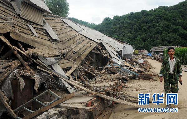 8月3日,樺甸市重災(zāi)區(qū)夾皮溝鎮(zhèn)一名村民從倒塌的房前走過。當(dāng)日,記者從吉林樺甸市政府了解到,截止到8月3日,該市洪災(zāi)死亡失蹤人口已經(jīng)達(dá)到48人,近20萬人口受災(zāi)。洪災(zāi)中,倒塌民房7677戶,損壞房屋19670間,F(xiàn)在樺甸市常山鎮(zhèn)、二道甸子鎮(zhèn)等重災(zāi)區(qū)正在籌備災(zāi)后重建。 新華社記者 宗巍 攝