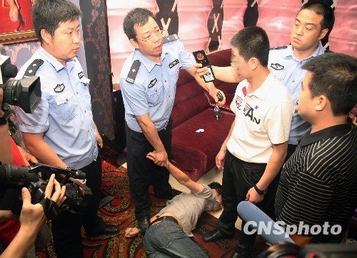 7月14日晚至15日凌晨,河北省石家莊市公安局調(diào)集警力,分組在火車站、長途客運站周邊地區(qū)及電子游藝廳、按摩店、KTV等娛樂場所進行隨機突擊清查,嚴厲打擊色情接站和賣淫嫖娼等各類違法活動。在該市“新蘭桂坊”俱樂部,一名醉酒男子阻止警方檢查,并對隨行記者進行打罵。圖為警察將涉嫌尋釁滋事男子制服。 中新社發(fā) 翟羽佳 從北京市公安機關(guān)關(guān)!疤焐先碎g”開始,借助公安部為期7個月的嚴打整治行動,一場掃黃風暴席卷大江南北。