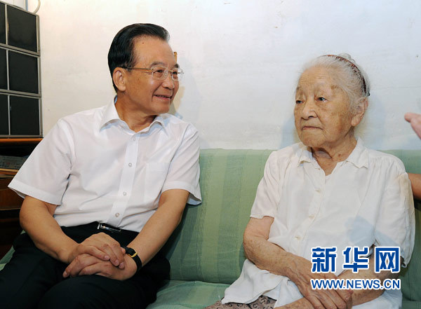 這是溫家寶在北京看望核物理學(xué)家何澤慧院士。 新華社記者 饒愛(ài)民 攝
