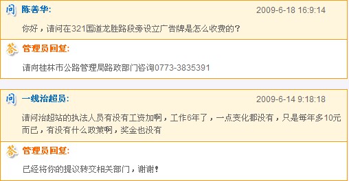 廣西壯族自治區(qū)公路管理局網站留言咨詢板塊的對話(截圖)
