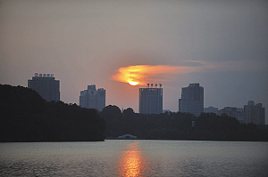 “彩云追日”景象昨日傍晚出現(xiàn)在玄武湖畔,落日在薄云映襯下好似一個(gè)正在燃燒的火炬。劉瀏 攝