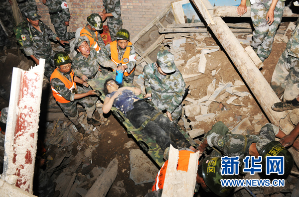 8月8日20時(shí)50分左右,蘭州軍區(qū)某防化團(tuán)官兵救出一名幸存者。甘肅舟曲縣特大山洪泥石流災(zāi)害發(fā)生后,蘭州軍區(qū)某防化團(tuán)602名官兵經(jīng)過(guò)6個(gè)多小時(shí)的急行軍到達(dá)災(zāi)區(qū),隨即展開(kāi)人員搜救,截至8日20時(shí)50分共救出9名幸存者。目前,官兵們?nèi)赃B夜奮戰(zhàn)在救援一線,爭(zhēng)分奪秒進(jìn)行生命大營(yíng)救。新華社發(fā) (張永進(jìn) 攝)