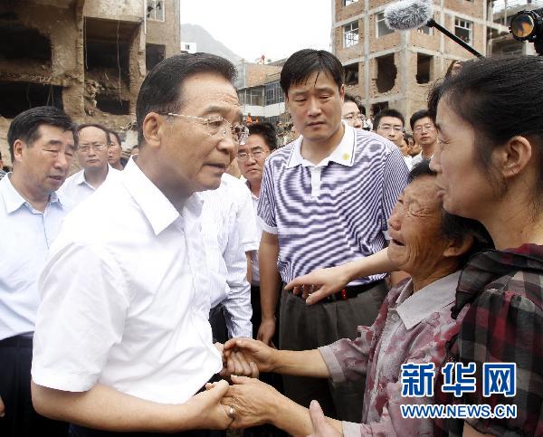 8月9日,中共中央政治局常委、國務院總理溫家寶繼續(xù)在甘肅舟曲縣特大山洪泥石流災區(qū)察看災情,指導抗洪搶險救災工作。這是溫家寶在舟曲縣災區(qū)撫慰失去親人的群眾。新華社記者 李學仁 攝