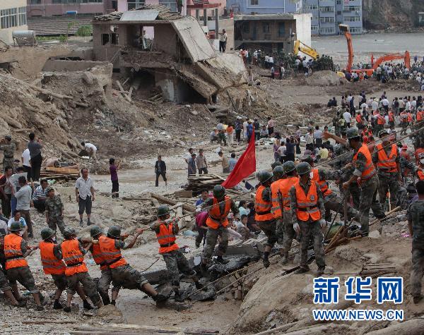 8月9日,救援人員在受災(zāi)現(xiàn)場(chǎng)開展救援。新華社記者 邢廣利 攝