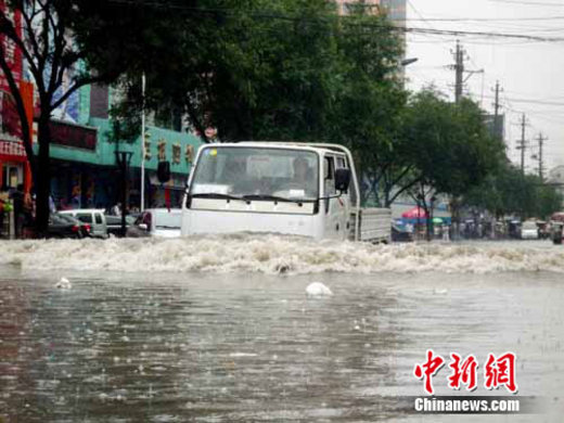 9日下午3時左右,山西運(yùn)城市上空烏云密布電閃雷鳴,緊接著暴雨傾盆而下,持續(xù)近40分鐘的暴雨讓運(yùn)城市區(qū)變成一片汪洋。圖為汽車在積水中艱難的行駛。 陳衛(wèi) 攝