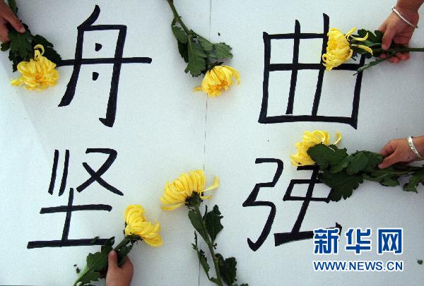 8月14日,山東郯城縣新愛(ài)嬰幼兒園的孩子們?yōu)橹矍鲭y同胞獻(xiàn)上黃菊,寄托哀思。當(dāng)日,郯城縣新愛(ài)嬰幼兒園開(kāi)展“情系舟曲大愛(ài)無(wú)疆”祈;顒(dòng),哀悼甘肅舟曲特大山洪泥石流遇難同胞,并為災(zāi)區(qū)祈福。新華社發(fā)(張春雷 攝)