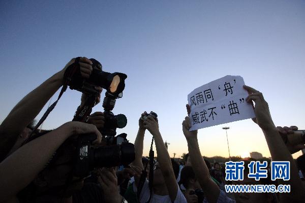 8月15日,北京天安門廣場(chǎng)降下半旗,向甘肅舟曲特大山洪泥石流遇難同胞志哀。這是一名男青年在天安門廣場(chǎng)手持寫有風(fēng)雨同“舟” 威武不“曲”的紙張。 新華社記者 任正來(lái) 攝