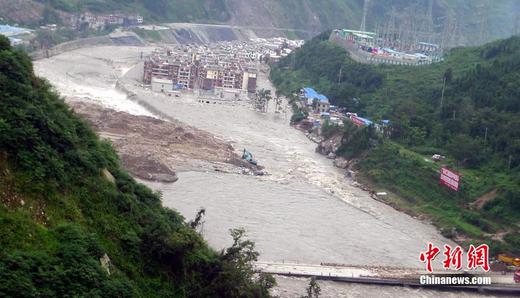 8月13日晚至14日凌晨,汶川縣境內(nèi)突降暴雨,導(dǎo)致映秀、漩口、銀杏等多個(gè)鄉(xiāng)鎮(zhèn)發(fā)生滑坡、泥石流等災(zāi)情,交通、通信、電力、供水中斷,岷江河段形成堰塞湖,將沿江的九寨溝環(huán)線、213國(guó)道淹沒(méi),道路中斷。圖為8月15日拍攝的被洪水圍困的映秀新鎮(zhèn)全貌。中新社發(fā) 李杰 攝