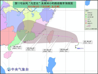 預計,“凡亞比”中心將以每小時10公里左右的速度向西偏北方向移動,逐漸向中國臺灣東部一帶沿?拷,強度繼續(xù)加強,將于19日白天在這一帶沿海登陸。