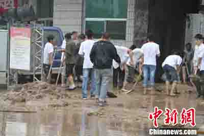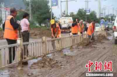呂梁市區(qū)發(fā)生暴雨襲擊后,環(huán)衛(wèi)工人在清理街道淤泥。高增平 攝