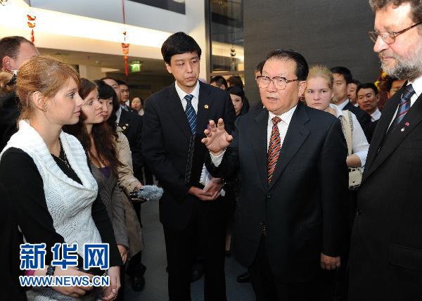 當?shù)貢r間9月22日,中共中央政治局常委李長春在塔林出席塔林大學孔子學院揭牌儀式。這是揭牌儀式結束后,李長春與愛沙尼亞學生交談。新華社記者 馬占成 攝