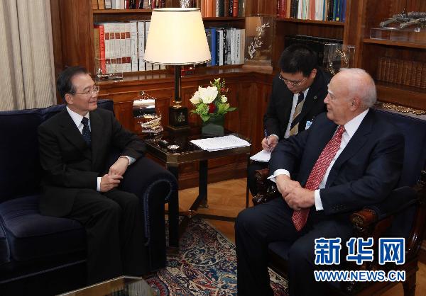10月3日,中國國務(wù)院總理溫家寶在雅典會見希臘總統(tǒng)帕普利亞斯。新華社記者龐興雷攝