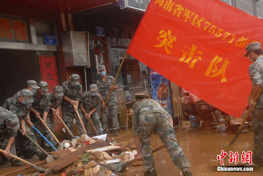 10月10日上午,持續(xù)多天強(qiáng)降雨的海南文昌市天空放晴,圍困文昌市區(qū)的洪水已消退,沿街商戶正在整理物品,清潔店面衛(wèi)生,供水供電在中午時分得以恢復(fù)。圖為海南省軍區(qū)某海防團(tuán)上百名官兵參與清潔城市參與衛(wèi)生。 中新社發(fā) 張成 攝