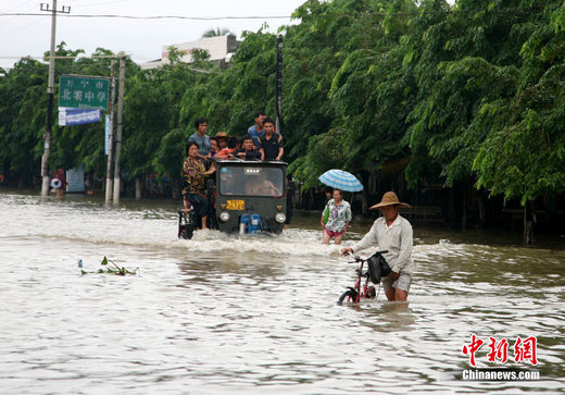 10月9日,海南省萬寧市萬城鎮(zhèn)北坡,暴雨過后的洪水依然沒有完全消退,民眾在洪水中艱難前行。自9月30日夜間至10月7日19時止,萬寧市連續(xù)8天普降大暴雨,局部特大暴雨,降雨量達(dá)1121.4毫米,全市20個觀測站累積降雨量均超過1000毫米,最大的為龍滾站1343.6毫米,過程雨量為歷史罕見。中新社記者 尹海明 攝