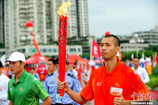 劉孝生邁開輕松的步伐在浸滿了雨水的紅地毯上跑過首棒的100多米,并將第二棒的火炬點(diǎn)燃。熄滅火炬后,劉孝生激動(dòng)地說,傳遞圣火很開心、很愉快,他今天很放松,接下來(lái)要做最后的備戰(zhàn),在亞運(yùn)會(huì)上為國(guó)爭(zhēng)光。