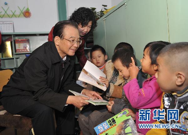 資料圖片:11月2日,中共中央政治局常委、國(guó)務(wù)院總理溫家寶來到北京兩所幼兒園就發(fā)展學(xué)前教育問題進(jìn)行調(diào)研,并與教師和家長(zhǎng)們座談。這是溫家寶在北京西城區(qū)西柳樹井幼兒園與孩子們交流。 新華社記者黃敬文攝