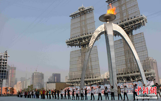 23日,海心沙亞運熊熊燃燒的主火炬下,一隊隊年輕人為閉幕式加緊排練。 中新社記者 張傳熙 攝