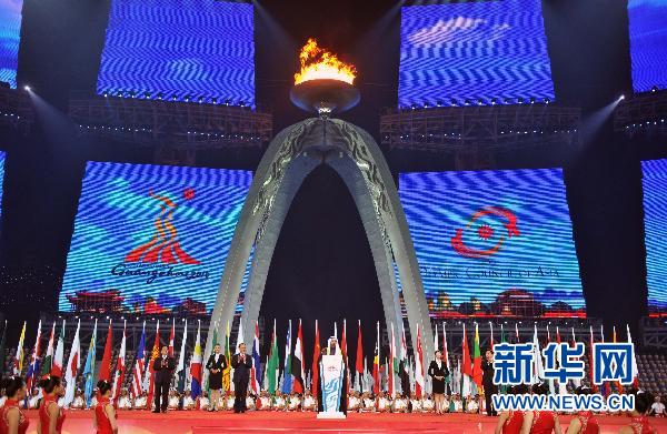 11月27日,亞奧理事會(huì)主席艾哈邁德·法赫德·薩巴赫親王宣布第16屆亞運(yùn)會(huì)閉幕。當(dāng)日,第16屆亞運(yùn)會(huì)在廣州市海心沙島舉行閉幕式。新華社記者劉大偉攝
