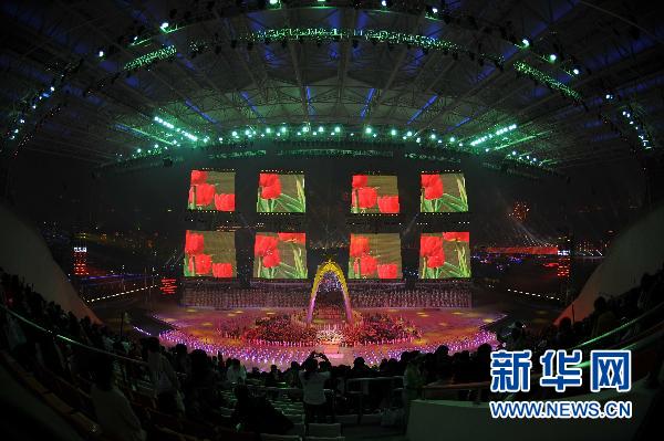 在嘹亮振奮的號(hào)角聲中,由眾多歌星激情演繹的大合唱《凱旋》掀起閉幕式的又一個(gè)高潮。