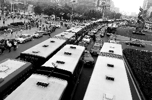 2010年7月21日下午,中關(guān)村海淀黃莊路口北,進(jìn)站的公交車(chē)排起長(zhǎng)隊(duì),好像一列“公交列車(chē)”。李飛 攝