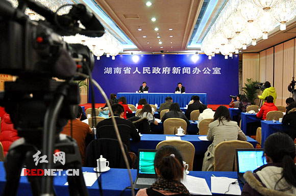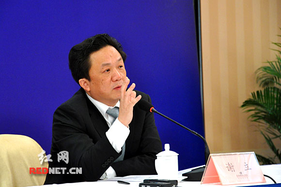 (湖南省環(huán)保廳副廳長、新聞發(fā)言人謝立在新聞發(fā)布會上回答記者提問。)