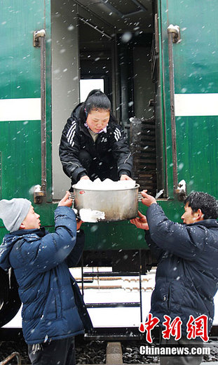 1月18日,一場大雪突降江西九江等地,江西贛北地區(qū)大雪紛飛,一片銀白,江西境內(nèi)的鐵路部門做好車輛防斷檢修和餐車食品供應(yīng)工作,確保人們出行安全暢通。圖為工作人員正在風雪中往客車上運送餐料食品。胡國林 攝