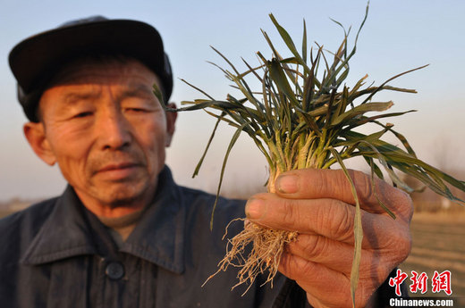 1月24日,山東鄒平縣好生鎮(zhèn)蒙二村村民在查看干旱的麥苗。據(jù)山東省防汛抗旱指揮部辦公室近日通報(bào),全省旱情仍在持續(xù)加劇,總體已達(dá)60年一遇標(biāo)準(zhǔn),抗旱形勢(shì)日趨嚴(yán)峻。 董乃德 攝