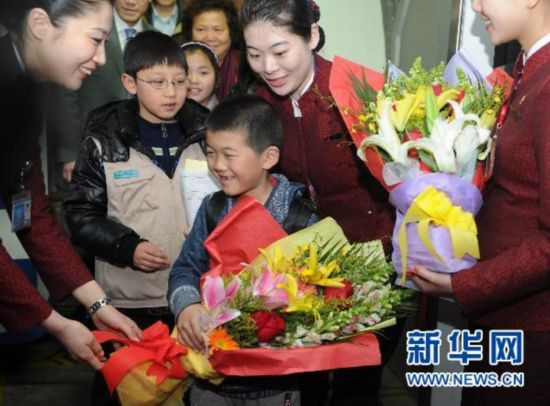 2月1日,北京小朋友郝桉(前)第一個走出機艙,收到國航工作人員送上的鮮花。當日16時50分,首批第一架搭載滯留埃及同胞的飛機抵達北京。第二架飛機將抵達廣州。兩架飛機共搭載480名滯留同胞。 新華社記者 金良快 攝