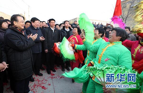 在中華民族傳統(tǒng)佳節(jié)春節(jié)來臨之際,2月2日至3日,農(nóng)歷臘月三十到大年初一,中共中央政治局常委、國務(wù)院總理溫家寶來到山東嘉祥縣、曲阜市看望農(nóng)民群眾。他深入麥田了解旱情,到水庫實地察看蓄水情況,到農(nóng)戶家中與農(nóng)民共度春節(jié)。這是2月3日,溫家寶在嘉祥縣疃里鎮(zhèn)賈橋村觀看農(nóng)民秧歌表演。新華社記者 姚大偉 攝