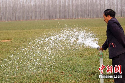2011年2月上旬,中國(guó)小麥主產(chǎn)區(qū)河南省南陽(yáng)市的農(nóng)民在積極抗旱澆麥。中新社記者 劉萬(wàn)強(qiáng) 攝