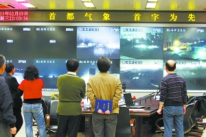 昨天21時30分 北京市氣象局辦公樓10層的天氣會商室里,燈火通明。大屏幕上,全市天氣云圖實時呈現(xiàn);電腦前,氣象專家和值班預(yù)報員目不轉(zhuǎn)睛地研究著多普勒雷達(dá)探測信息;氣象局領(lǐng)導(dǎo)坐鎮(zhèn)指揮,不時與前方觀測點進(jìn)行通話。