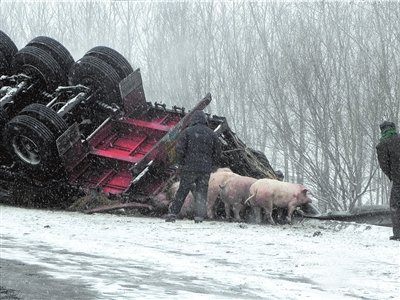京沈高速玉田段,一輛運(yùn)豬大貨側(cè)翻。
