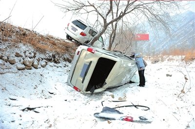 門頭溝忠良書院附近,兩輛車一掛樹一翻溝。本報(bào)記者王苡萱攝