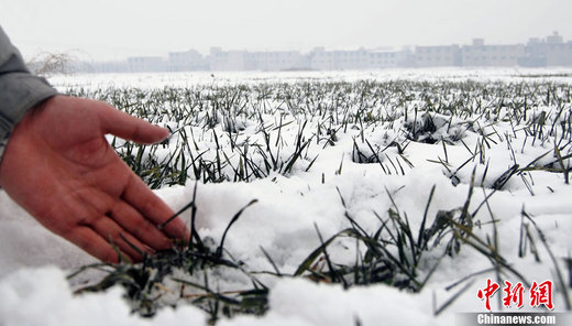 2月10日,河北省氣象局稱:為緩解50年一遇的旱情,該省已在石家莊、保定、邢臺、邯鄲、承德、廊坊、張家口等地共發(fā)射火箭彈231枚、炮彈40發(fā)、煙條155條進行人工增雪作業(yè)。據(jù)悉,本次降雪對增加土壤墑情、降低森林草原火險等級較有利,在一定程度上為干旱的麥苗“解渴”。圖為石家莊一麥田積雪已達4厘米左右。 中新社記者 翟羽佳 攝