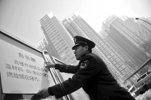 昨日上午,消防人員在怡;▓@高樓旁立告示牌。本報(bào)記者 李強(qiáng) 攝